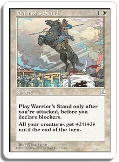 Play Warrior's Stand only after you're attacked, before you declare blockers. All your creatures get +2/+2 until the end of the turn.