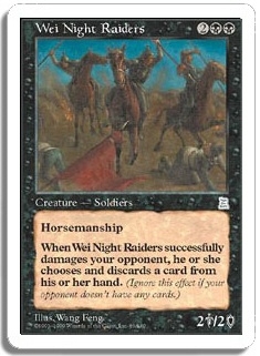 Horsemanship. When Wei Night Raiders successfully damages your opponent, he or she chooses and discards a card from his or her hand. (Ignore this effect if your opponent doesn't have any cards.)