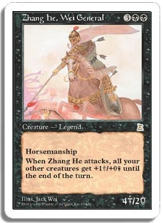 Horsemanship. When Zhang He attacks, all your other creatures get +1/+0 until the end of the turn.