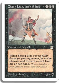 When Zhang Liao successfully damages your opponent, he or she chooses and discard a card from his or her hand. (Ignore this effect if your opponent doesn't have any cards.)