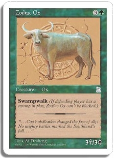 Swampwalk (If defending player has a swamp in play, Zodiac Ox can't be blocked.)