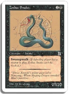Swampwalk (If defending player has a swamp in play, Zodiac Snake can't be blocked.)
