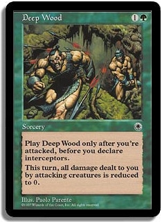 Play Deep Wood only after you're attacked, before you declare interceptors. This turn, all damage dealt to you by attacking creatures is reduced to 0.
