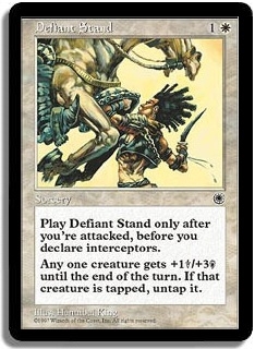 Play Defiant Stand only after you're attacked, before you declare interceptors. Any one creature gets +1[O]/+3[D] until the end of the turn. If that creature is tapped, untap it.