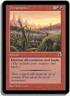 Destroy all creatures and lands. (This includes your creatures and lands.)