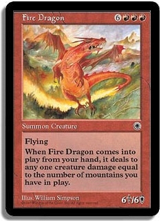 When Fire Dragon comes into play from your hand, it deals to any one creature damage equal to the number of mountains you have in play.