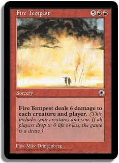 Fire Tempest deals 6 damage to each creature and player. (This includes your creatures and you. If all players drop to 0 life or less, the game is a draw.)