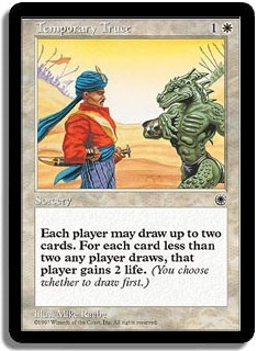 Each player may draw up to two cards. For each card less than two any player draws, that player gains 2 life. (You choose whether to draw first.)