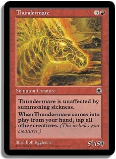 Thundermare is unaffected by summoning sickness. When Thundermare comes into play, tap all other creatures.