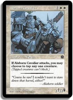 If Alaborn Cavalier attacks, you may choose to tap any one creature. (Tapped creatures can't block.)