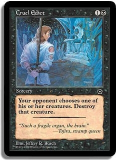 Your opponent chooses one of his or her creatures. Destroy that creature.
