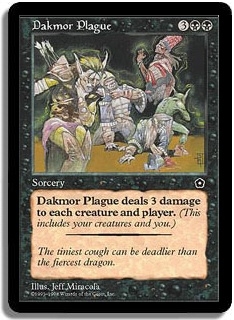 Dakmor Plague deals 3 damage to each creature and player. (This includes your creatures and you.)