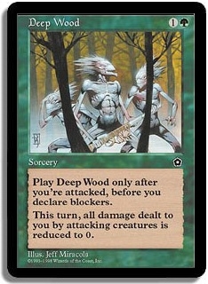 Play Deep Wood only after you're attacked, before you declare blockers. This turn, all damage dealt to you by attacking creatures is reduced to 0.