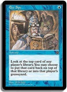 Look at the top card of any player's library. You may choose to put that card back on top of that library or into that player's graveyard.