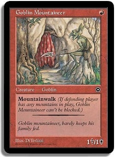 Mountainwalk (If defending player has any mountains in play, Goblin Mountaineer can't be blocked.)