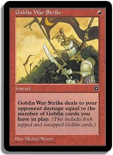 Goblin War Strike deals to your opponent damage equal to the number of Goblin cards you have in play. (This includes both tapped and untapped Goblin cards.)