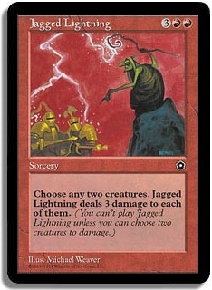 Choose any two creatures. Jagged Lightning deals 3 damage to each of them. (You can't play Jagged Lightning unless you can choose two creatures to damage.)