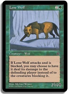 If Lone Wolf attacks and is blocked, you may choose to have it deal its damage to the defending player instead of to the creatures blocking it.