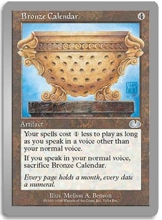 Your spells cost 1 less to play as long as you speak in a voice other than your normal voice. If you speak in your normal voice, sacrifice Bronze Calendar.