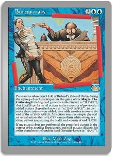 Pursuant to subsection 3.1(4) of Richard's Rules of Order, during the upkeep of each participant in this game of the Magic: The Gathering trading card game (hereafter known as "PLAYER"), that PLAYER performs all actions in the sequence of previously added actions (hereafter known as "ACTION QUEUE"), in the order those actions were added, then adds another action to the end of the ACTION QUEUE. All actions must be simple physical or verbal actions that a PLAYER can perform while sitting in a chair, without jeopardizing the health and security of said PLAYER. If any PLAYER does not perform all the prescribed actions in the correct order, sacrifice Bureacuracy and said PLAYER discards his or her complement of cards in hand (hereafter known as "HAND").