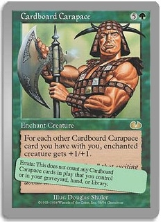 For each other Cardboard Carapace card you have with you, enchanted creature gets +1/+1. Errata: This does not count any Cardboard Carapace cards in play that you control or in your graveyard, hand, or library.