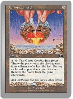 4, Tap: Tear Chaos Confetti into pieces. Throw the pieces onto the playing area from a distance of at least five feet. Destroy each card in play that a piece touches. Remove the pieces from the game afterwards.