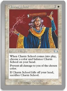 When Charm School comes into play, choose a color and balance Charm School on your head. Prevent all damage to you of the chosen color. If Charm School falls off your head, sacrifice Charm School.