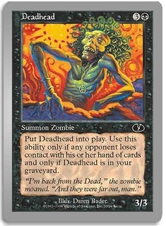 Put Deadhead into play. Use this ability only if any opponent loses contact with his or her hand of cards and only if Deadhead is in your graveyard.