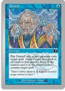 Play Denied! only as any opponent casts target spell. Name a card, then look at all cards in that player's hand. If the named card is in the player's hand, counter target spell.