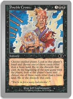 Choose another player. Look at that player's hand and choose one of those cards other than a basic land. He or she discards that card. At the beginning of the next game with the player, look at the player's hand and choose one of those cards other than a basic land. He or she discards that card.