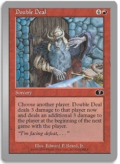 Choose another player. Double Deal deals 3 damage to that player now and deals an additional 3 damage to the player at the beginning of the next game with the player.