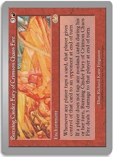 Whenever any player taps a card, that player gives control of that card to an opponent at end of turn. If a player does not tap any nonland cards during his or her turn, Burning Cinder Fury of Crimson Chaos Fire deals 3 damage to that player at end of turn.