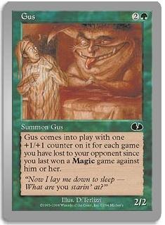 Gus comes into play with one +1/+1 counter on it for each game you have lost to your opponent since you last won a Magic game against him or her.