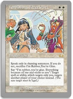 Speak only in rhyming sentences. If you do not, sacrifice I'm Rubber, You're Glue. Say "I'm rubber, you're glue. Everything bounces off me and sticks to you": Target spell or ability, which targets only you, targets another player of your choice instead. (The new target must be legal.)