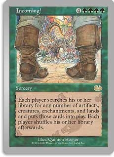 Each player searches his or her library for any number of artifacts, creatures, enchantments, and lands and puts those cards into play. Each player shuffles his or her library afterwards.