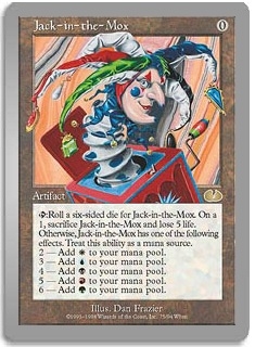 T: Roll a six-sided die for Jack-in-the-Mox. On a 1, sacrifice Jack-in-the-Mox and lose 5 life. Otherwise, Jack-in-the-Mox has one of the following effects. Treat this ability as a mana source. 2 - Add W to your mana pool. 3 - Add U to your mana pool. 4 - Add B to your mana pool. 5 - Add R to your mana pool. 6 - Add G to your mana pool.