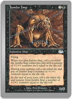 Flying When you play Jumbo Imp, roll a six-sided die. Jumbo Imp comes into play with a number of +1/+1 counters on it equal to the die roll. During your upkeep, roll a six-sided die and put on Jumbo Imp a number of +1/+1 counters equal to the die roll. At the end of your turn, roll a six-sided die and remove from Jumbo Imp a number of +1/+1 counters equal to the die roll.