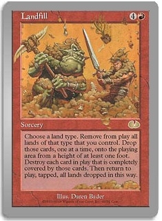Choose a land type. Remove from play all lands of that type that you control. Drop those cards, one at a time, onto the playing area from a height of at least one foot. Destroy each card in play that is completely covered by those cards. Then return to play, tapped, all lands dropped in this way.