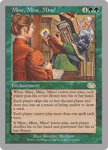 When Mine, Mine, Mine! comes into play, each player puts his or her library into his or her hand. Each player skips his or her discard phase and does not lose as a result of being unable to draw a card. Each player cannot play more than one spell each turn. If Mine, Mine, Mine! leaves play, each player shuffles his or her hand and graveyard into his or her library.