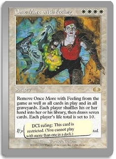 Remove Once More with Feeling from the game as well as all cards in play and in all graveyards. Each player shuffles his or her hand into her or his library, then draws seven cards. Each player's life total is set to 10. DCI ruling: This card is restricted. (You cannot play with more than one in a deck.)