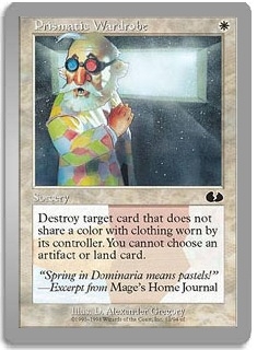 Destroy target card that does not share a color with clothing worn by its controller. You cannot choose an artifact or land card.