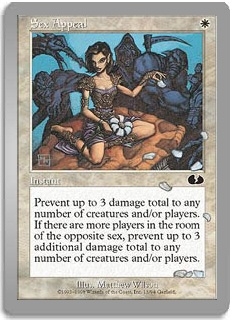 Prevent up to 3 damage total to any number of creatures and/or players. If there are more players in the room of the opposite sex, prevent up to 3 additional damage total to any number of creatures and/or players.
