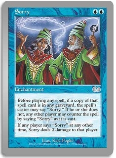 Before playing any spell, if a copy of that spell card is in any graveyard, the spell's caster may say "Sorry." If he or she does not, any other player may counter the spell by saying "Sorry" as it is cast. If any player says "Sorry" at any other time, Sorry deals 2 damage to that player.