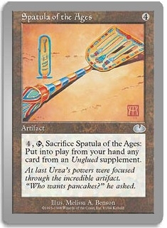 4, Tap: Sacrifice Spatula of the Ages: Put into play from your hand any card from an Unglued supplement.