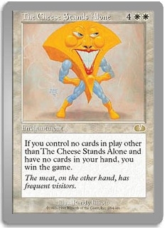 If you control no cards in play other than The Cheese Stands Alone and have no cards in your hand, you win the game.