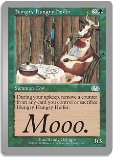During your upkeep, remove a counter from any card you control or sacrifice Hungry Hungry Heifer.