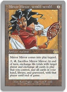 Mirror Mirror comes into play tapped. 7, T, Sacrifice Mirror Mirror: At end of turn, exchange life totals with target player and exchange all cards in play that you control, and all cards in your hand, library, and graveyard, with that player until end of game.