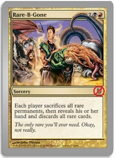 Each player sacrifices all rare permanents, then reveals his or her hand and discards all rare cards.