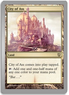 City of Ass comes into play tapped. Tap: Add one and one-half mana of any one color to your mana pool.