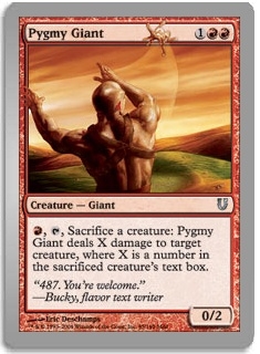 R, Tap, Sacrifice a creature: Pygmy Giant deals X damage to target creature, where X is a number in the sacrificed creature's text box.